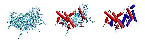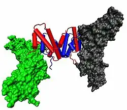The biologically active dimer is formed by anti-parallel inter-locking of the two monomers as shown below. In the cartoon model, one monomer is shown in red, the other in blue.