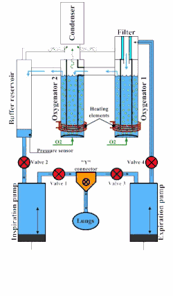 - Inspiratory pump inserts a volume of PFC in the lungs (valve 1 open, valve 2 closed), and the expiratory pump pushes PFC in the oxygenator via the filter (valve 3 closed, valve 4 open).