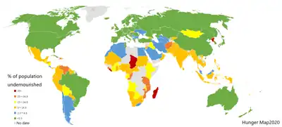 There were 821 million undernourished people in the world in 2018 (10.8% of the total population).[19] This is a reduction of about 176 million people since 1990 when 23% were undernourished, but an increase of about 36 million since 2015, when 10.6% were undernourished.[10][20] In 2012, it was estimated that another billion people had a lack of vitamins, and minerals.[6] In 2015, protein-energy malnutrition was estimated to have resulted in 323,000 deaths—down from 510,000 deaths in 1990.[11][21] Other nutritional deficiencies, which include iodine deficiency and iron deficiency anemia, result in another 83,000 deaths.[11] In 2010, malnutrition was the cause of 1.4% of all disability adjusted life years.[6][22] About a third of deaths in children are believed to be due to undernutrition, although the deaths are rarely labelled as such.[5] In 2010, it was estimated to have contributed to about 1.5 million deaths in women and children,[23] though some estimate the number may be greater than 3 million.[8] An additional 165 million children were estimated to have stunted growth from malnutrition in 2013.[8] Undernutrition is more common in developing countries.[24] Certain groups have higher rates of undernutrition, including women—in particular while pregnant or breastfeeding—children under five years of age, and the elderly. In the elderly, undernutrition becomes more common due to physical, psychological, and social factors.[25]