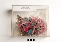 Structurally, the cortex consists of cortical labyrinth and medullary rays.[9] The cortical labyrinth contains interlobular arteries, vascular networks formed by afferent and efferent arterioles, renal corpuscles, proximal convoluted tubules, macula densa, distal convoluted tubules, connecting tubules and the initial parts of the collecting ducts.[72] The proximal convoluted tubules predominate in the cortical labyrinth.[73] The continuous layer of the cortex lying above the medullary rays is called the cortex corticis.[9] Cortex corticis differs from the rest of the cortical labyrinth in that it doesn't contain glomeruli.[74][75] Some mammals (for example, pig) have nephrons whose loops of Henle do not reach the medulla; such nephrons are called cortical nephrons.[68][76] Cortical nephrons have a very short thin segment of the loop of Henle, and this segment may even be absent.[76] The medullary rays of the cortex contain the proximal straight tubules, the cortical part of the thick ascending limb of the loops of Henle, and the cortical part of the collecting ducts.[72] The cortex is divided into lobules, each of which is a medullary ray in conjunction with connected to it nephrons, and interlobular arteries that pass between the lobules.[77]