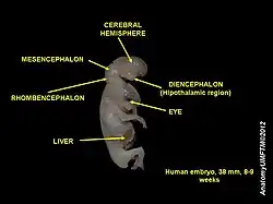 During embryonic development, the midbrain (also known as the mesencephalon) arises from the second vesicle of the neural tube, while the interior of this portion of the tube becomes the cerebral aqueduct. Unlike the other two vesicles – the forebrain and hindbrain – the midbrain does not develop further subdivision for the remainder of neural development. It does not split into other brain areas. While the forebrain, for example, divides into the telencephalon and the diencephalon.[13]