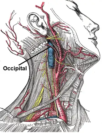 The occipital artery arises from (the posterior aspect of) the external carotid artery (some 2 cm distal to the origin of the external carotid artery).[1]