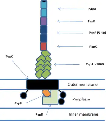 The fimbria is assembled by a chaperone-usher system, and proteins required for the assembly are expressed by the Pap operon, which is located on pathogenicity islands. The genes of the Pap operon encode five structural proteins (PapA, PapK, PapE, PapF and PapG), four proteins involved in the transport and assembly (PapD, PapH, PapC, PapJ) and two proteins (PapB, PapI) regulating the operon expression.[6][7]
