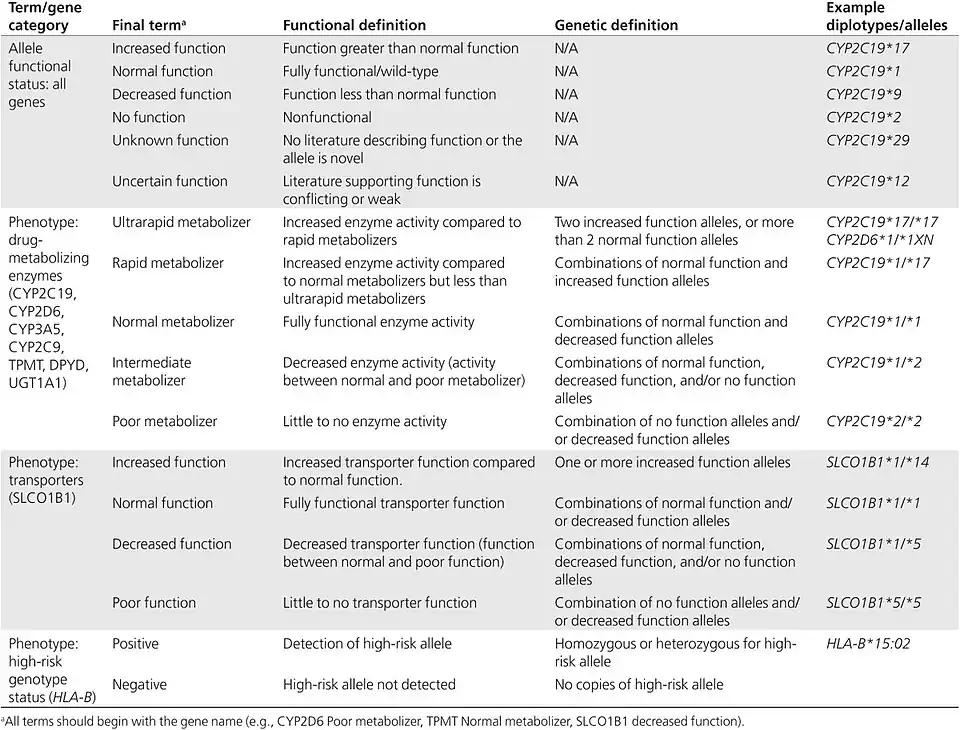 In 2017 CPIC published results of an expert survey to standardize terms related to clinical pharmacogenetic test results.[31] Consensus for terms to describe allele functional status, phenotype for drug metabolizing enzymes, phenotype for drug transporters, and phenotype for high-risk genotype status was reached.