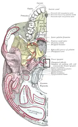Base of skull. Inferior surface. (Pharyngeal tubercle labeled at right, eighth from the bottom.)
