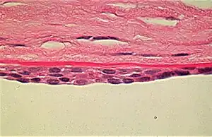 Posterior polymorphous corneal dystrophy (PPCD; sometimes also Schlichting dystrophy) is a type of corneal dystrophy, characterised by changes in Descemet's membrane and endothelial layer. Symptoms mainly consist of decreased vision due to corneal edema. In some cases they are present from birth, other patients are asymptomatic. Histopathological analysis shows that the cells of endothelium have some characteristics of epithelial cells and have become multilayered. The disease was first described in 1916 by Koeppe as keratitis bullosa interna.[1]