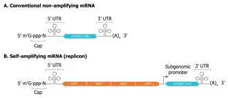- ↑ Pourseif MM, Masoudi-Sobhanzadeh Y, Azari E, Parvizpour S, Barar J, Ansari R, et al. (November 2022). "Self-amplifying mRNA vaccines: Mode of action, design, development and optimization". Drug Discovery Today. 27 (11) 103341. doi:10.1016/j.drudis.2022.103341. PMID 35988718.