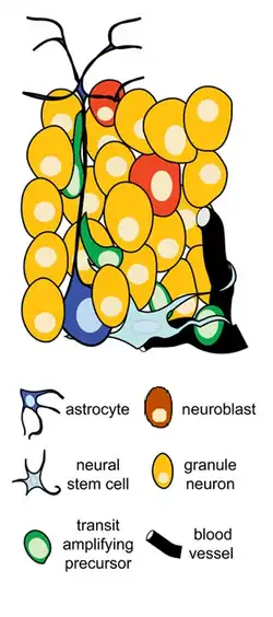 - ↑ Seri, Bettina; García-Verdugo, José Manuel; Collado-Morente, Lucia; McEwen, Bruce S.; Alvarez-Buylla, Arturo (2004). "Cell types, lineage, and architecture of the germinal zone in the adult dentate gyrus". Journal of Comparative Neurology. 478 (4): 359–378. doi:10.1002/cne.20288. PMID 15384070. S2CID 38269066.