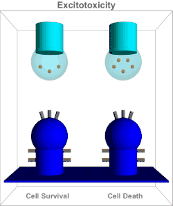 | A common cause of synaptopathy is glutamate excitotoxicity. As shown in the animation, the over-activation of NMDA receptors leads to an increase in free intracellular calcium, which produces oxygen free-radicals and eventually neuronal dysfunction.[1] |