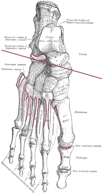 The transverse tarsal joint or midtarsal joint or Chopart's joint is a compound intertarsal synovial joint formed by the articulation of the calcaneus with the cuboid (the calcaneocuboid joint), and the articulation of the talus with the navicular (the talocalcaneonavicular joint).