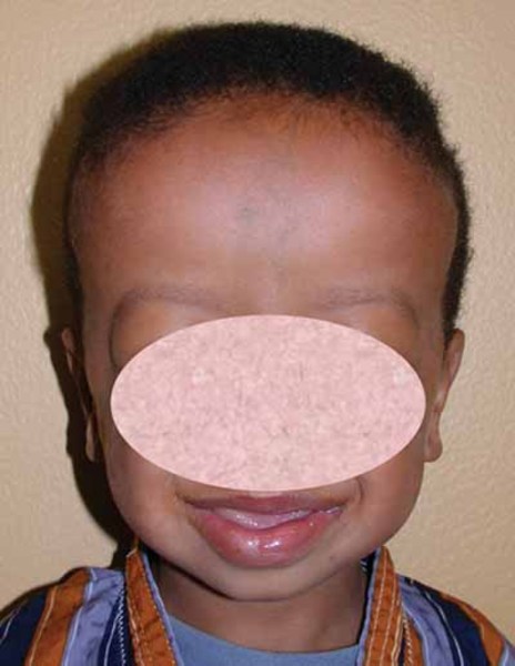 , thick and highly arched eyebrows, abnormalities of the outer ear, a short nose