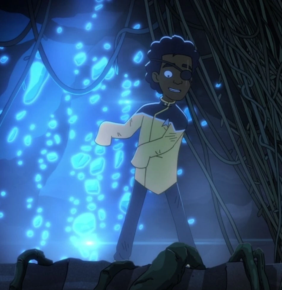 Later still, he accompanied Asif and Karavitus on an away mission to Glish led by Lieutenant jg Beckett Mariner. En route, Mariner was forced to crash land their shuttlecraft into a cave when it was hit by a magnetic anomaly. The cave contained deposits of pergium which was needed to restore the shuttle's power. Unfortunately, to get to the pergium, they needed to negotiate the biotemporal flux from a mineral vein that emitted chronitons, which caused rapid aging. While Mariner, Karavitus, and Asif struggled to reach the pergium mine, Amadou obtained pergium from another mine where the effects of the chronitons caused him to get younger. (LD: "Caves")