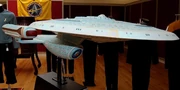The studio model was featured in the documentary Star Trek: Beyond the Final Frontier due to its appearance in Christie's 40 Years of Star Trek: The Collection auction. The model, now with the starboard nacelle strut cut as well in order to restore the symmetry of the model's warp engine array (it had not been for its appearance in the Exhibition tour), was listed as Lot 694(X) and estimated at US$8,000-$12,000, selling on 7 October 2006 with a winning bid of US$40,000 ($48,000 including buyer's premium) to Adrian Hancock, the same British collector who also acquired the Intrepid-class, and the D'deridex-class studio models. [14](X) Prior to its sale, the model was on pre-auction views at Christie's London-based auction house from 3 August through 8 August, and subsequently at their New York City-based auction house from 29 September through 4 October, 2006. [15]