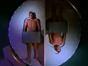 The duplicator consisted of a large turntable that had slotted positions on either side of the turntable for the "blank" and "template"-being, both separated by a divider, and both with a locking mechanism placed mid-torso. On either side, paralleling the turntable, were two electronic components that were physically responsible for the duplication.