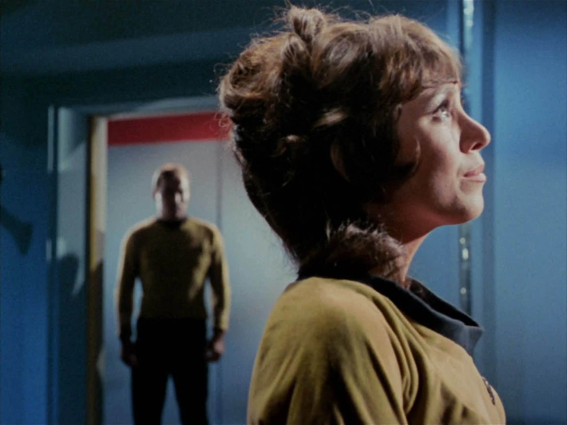 Kirk is then forced to console Tomlinson's grief-stricken fiancée, Angela Martine, while she stands alone in the chapel. "It never makes any sense. We both have to know that there was a reason," Kirk says softly to Martine. She tearfully assures the captain that she will be fine and leaves. Kirk watches Angela go and then leaves the chapel too, striding purposefully down the ship's corridor.