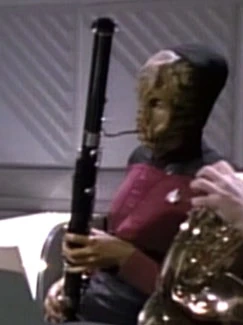 An alien crewmember of the USS Enterprise-D played the bassoon during a concert in Ten Forward in the year 2367. Data, Jenna D'Sora and Keiko O'Brien also participated in that concert. (TNG: "In Theory")