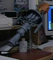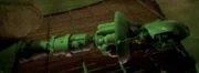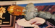 Jein's copy, when not in use as set dressing, resided initially on the desk of Mike Okuda in his office at the art department (DS9 Season 2 DVD-special feature, "Hidden File 01: Mike Okuda"), and later in front of the bulletin board of the department, suspended on wires from the ceiling. [7] Aside from its appearances as display model in the two Deep Space Nine episodes (only the wall chart was featured in "The Nagus"), the model has made one last appearance as such in Star Trek: Voyager's fifth season episode "Juggernaut", this time posing as a model of an old Malon ship, the Malon Pelk had built for the son of his colleague Fesek. In the episode Pelk even paid indirect homage to the quality of Jein's work when stating, "Hey, what do you think? Look at the detail on the dorsal plating," though strong green light flooding obscured the original colors of the model for its appearance in the episode. Ultimately, the display model met with a dismal fate, as Drexler later clarified, "The warp ship was dropped, and the cabin shattered. I have the pieces, and hopefully I will have some time to put it back together." [8](X)
