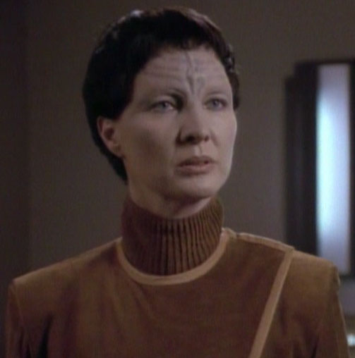 Callan White (born 21 August 1953; age 71) is the actress who played Krite in the Star Trek: The Next Generation fifth season episode "The Outcast". She filmed her scenes between Monday 6 January 1992 and Wednesday 8 January 1992 and on Monday 13 January 1992 on Paramount Stage 8, 9, and 16. Two of her costumes from this episode were sold off on the It's A Wrap! sale and auction on eBay. [1](X) [2](X)