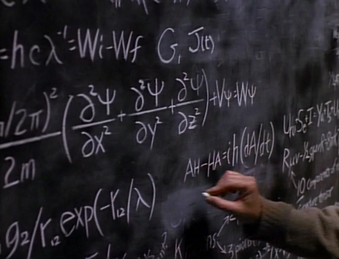 In 2367, a hologram of Albert Einstein wrote on a blackboard with chalk as Reginald Barclay and Geordi La Forge looked on. (TNG: "The Nth Degree")