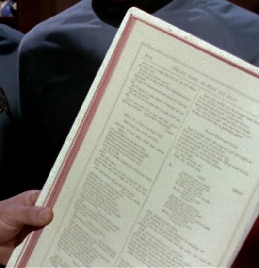 In 2168, a copy of the book was left on the planet Sigma Iotia II by a crew member of the starship Horizon. The book, which remained on the surface of the planet after the Horizon landing party had departed, was later discovered by the native Iotians, a highly imitative race. The Iotians reinvented their entire society based on the information in the book, thinking it was the model for a perfect society. Iotians treated The Book, as they called it, with near-religious reverence, and did not tolerate any disrespect against it. Copies of The Book could be found everywhere in Iotian society, including the headquarters of every major Boss. (TOS: "A Piece of the Action")