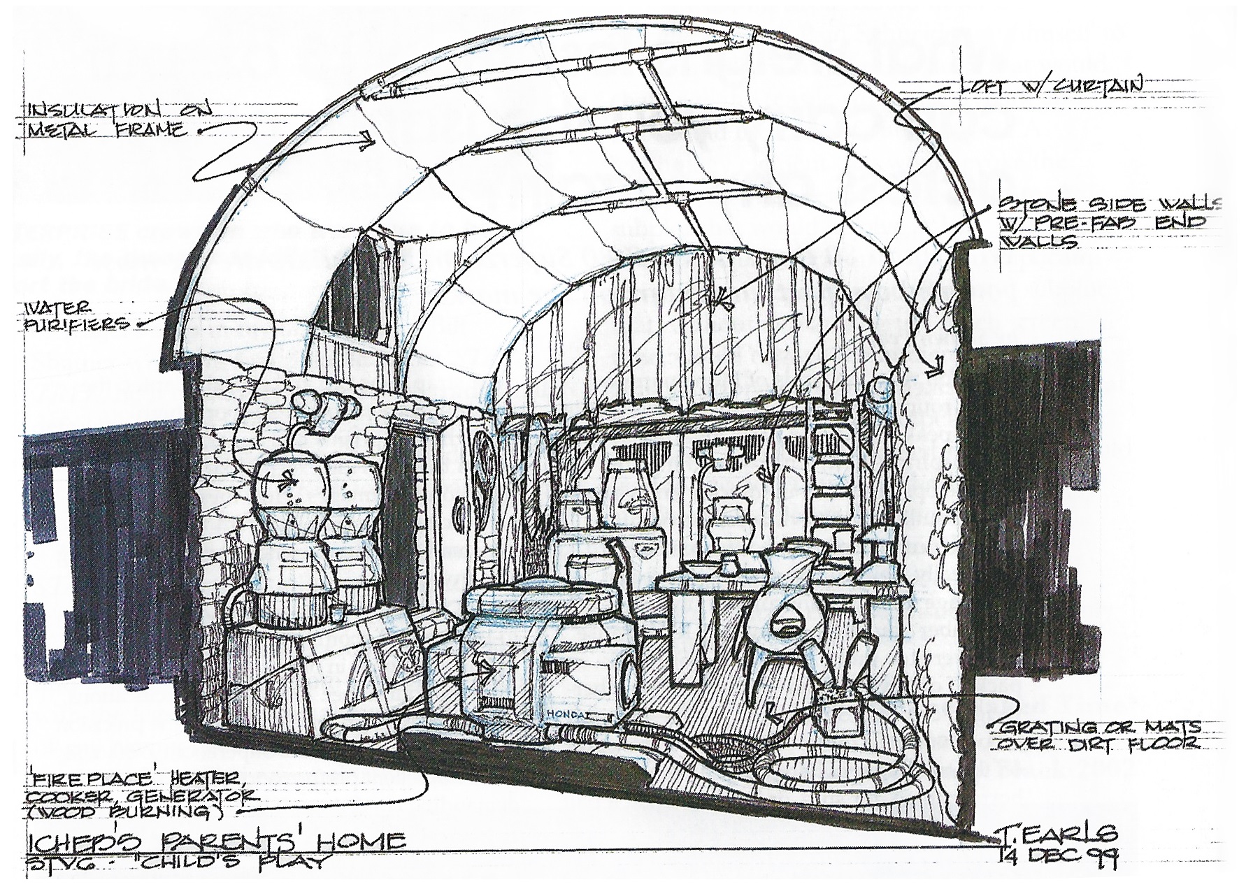 - Yifay and Leucon's primitive Brunali home was designed by Tim Earls and constructed on a sound stage. Earls described the design as "It's basically a frontier kind of thing. We knew that they had a very high level of technology, because they had warp drive, but they were living in primitive conditions. The idea was to start with a stone structure – they had used material that they found around them to build a base – and then they created a framework on top of that with a kind of high-tech thermal blanket." Earls' design also included water purifiers and a wood-burning generator (jokingly labeled "Honda.") (Star Trek: The Magazine Volume 2, Issue 11, p. 22)