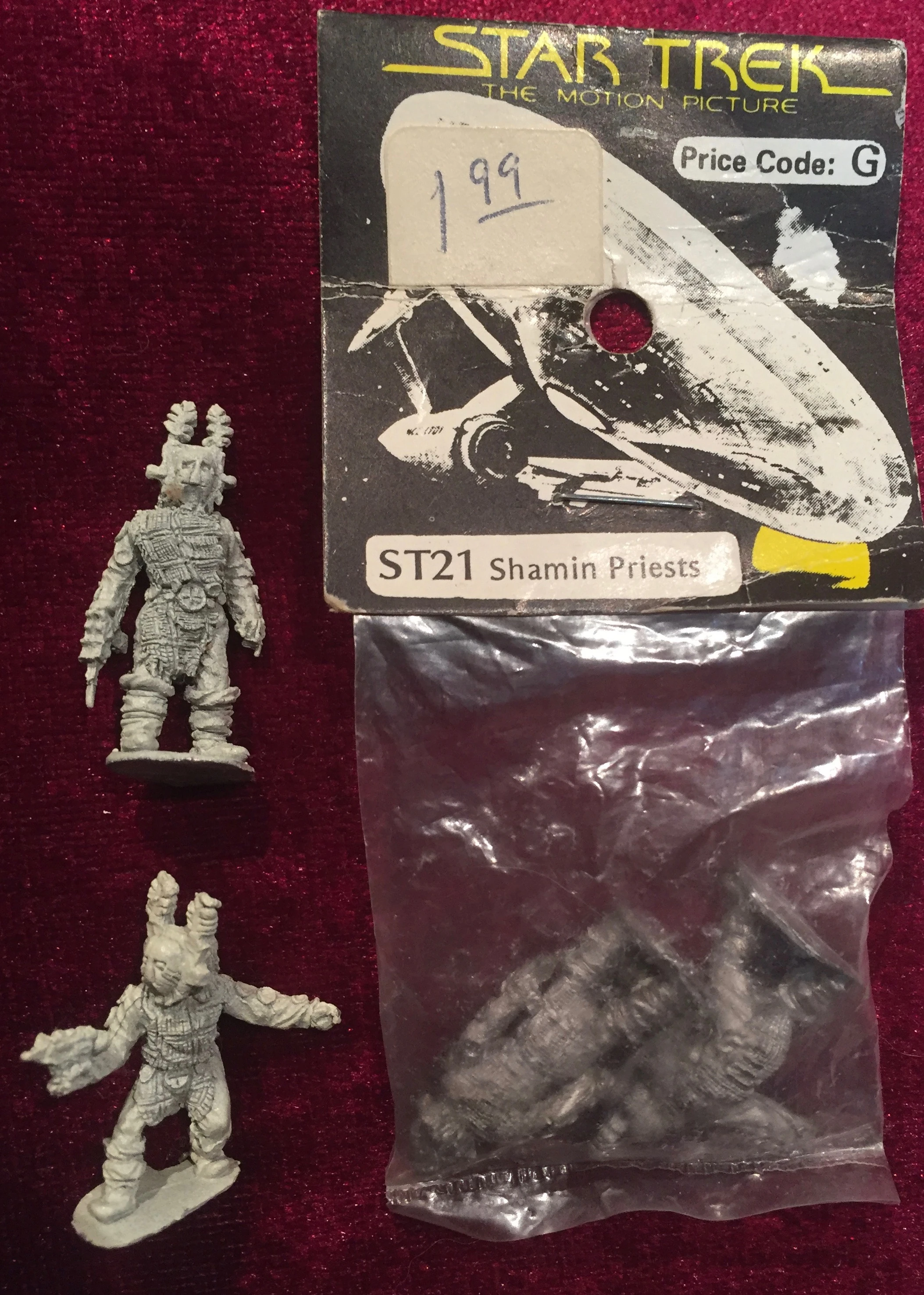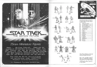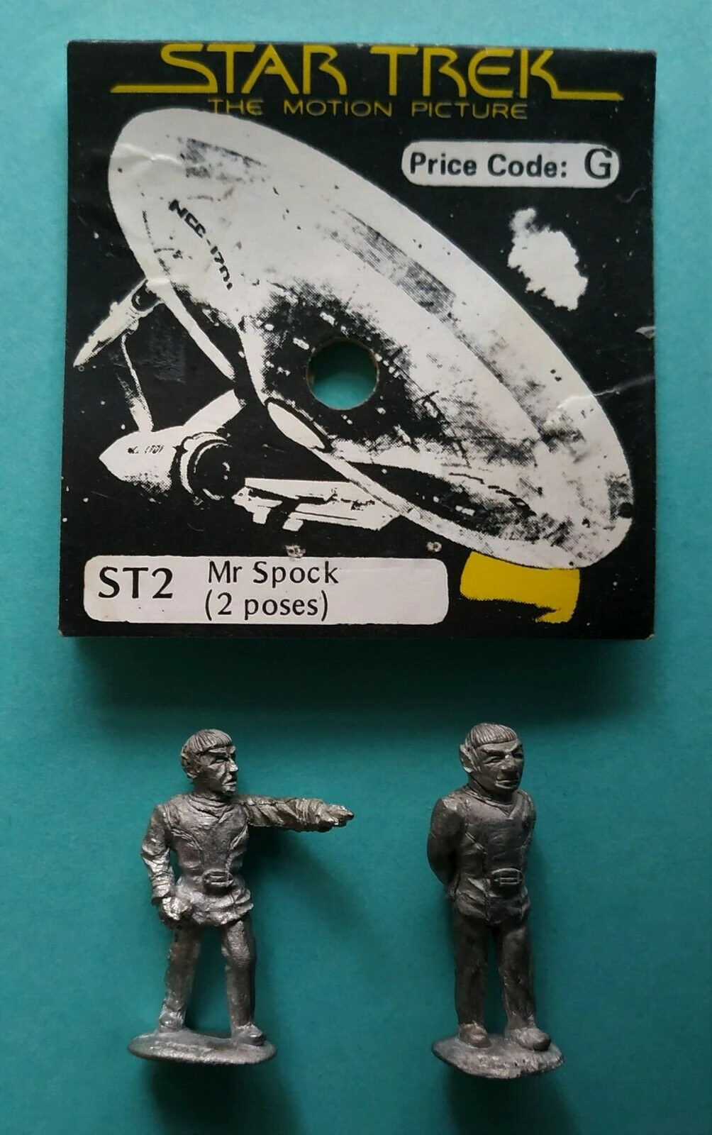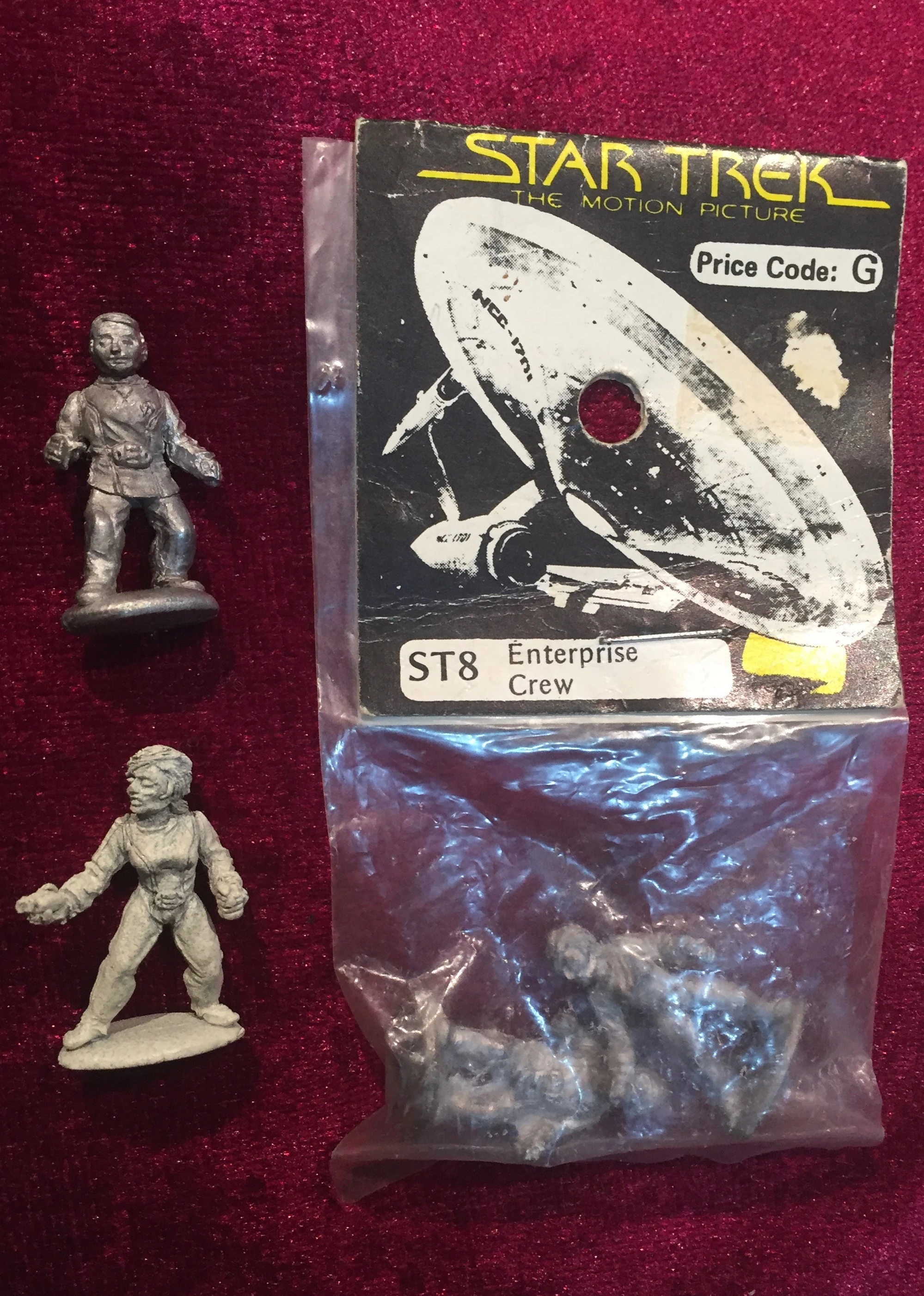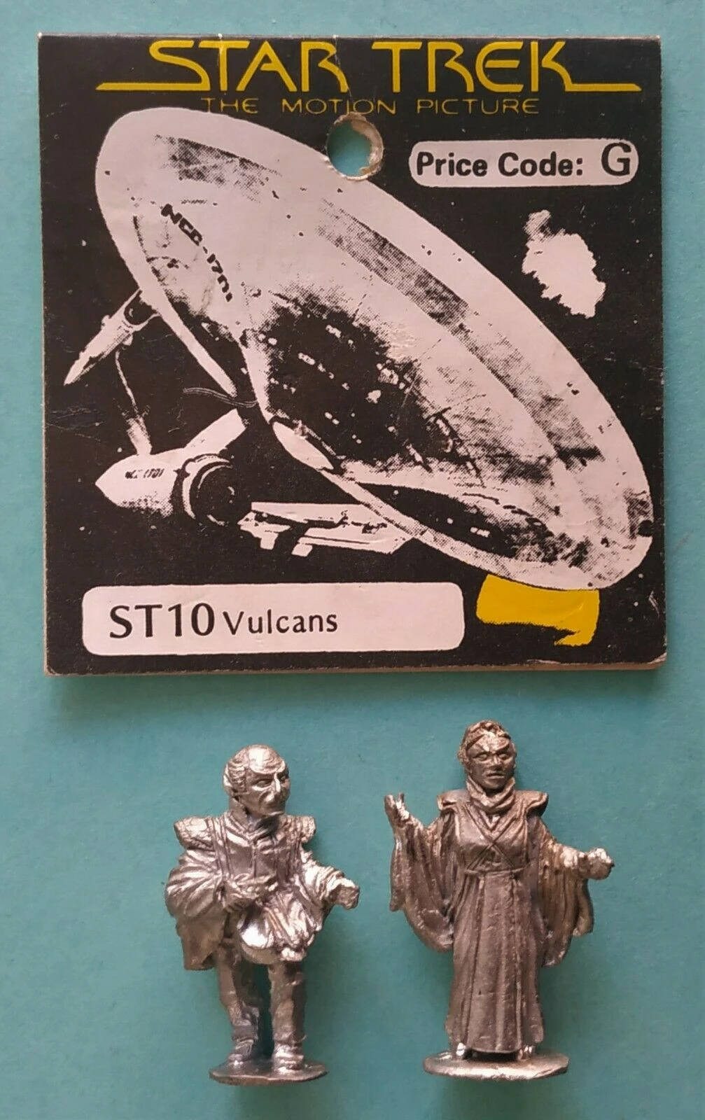 In early 1980, the company issued a line of licensed (as indicated in its Red Catalog of that year) Star Trek 25mm gaming figurine miniatures, capitalizing on Star Trek: The Motion Picture, and associating them with the multitude of background aliens seen in the feature. Sold in 24 pairs, the 25mm white-metal gaming figurines were Citadel originals, not derived from FASA, unlike its later starship miniatures line. The figurines came packaged in a plastic bag stapled shut at the top with an doublefolded identifier header card. There were also four 54mm figures: Kirk in command chair, Spock, Ilia Probe and the Klingon Captain.