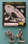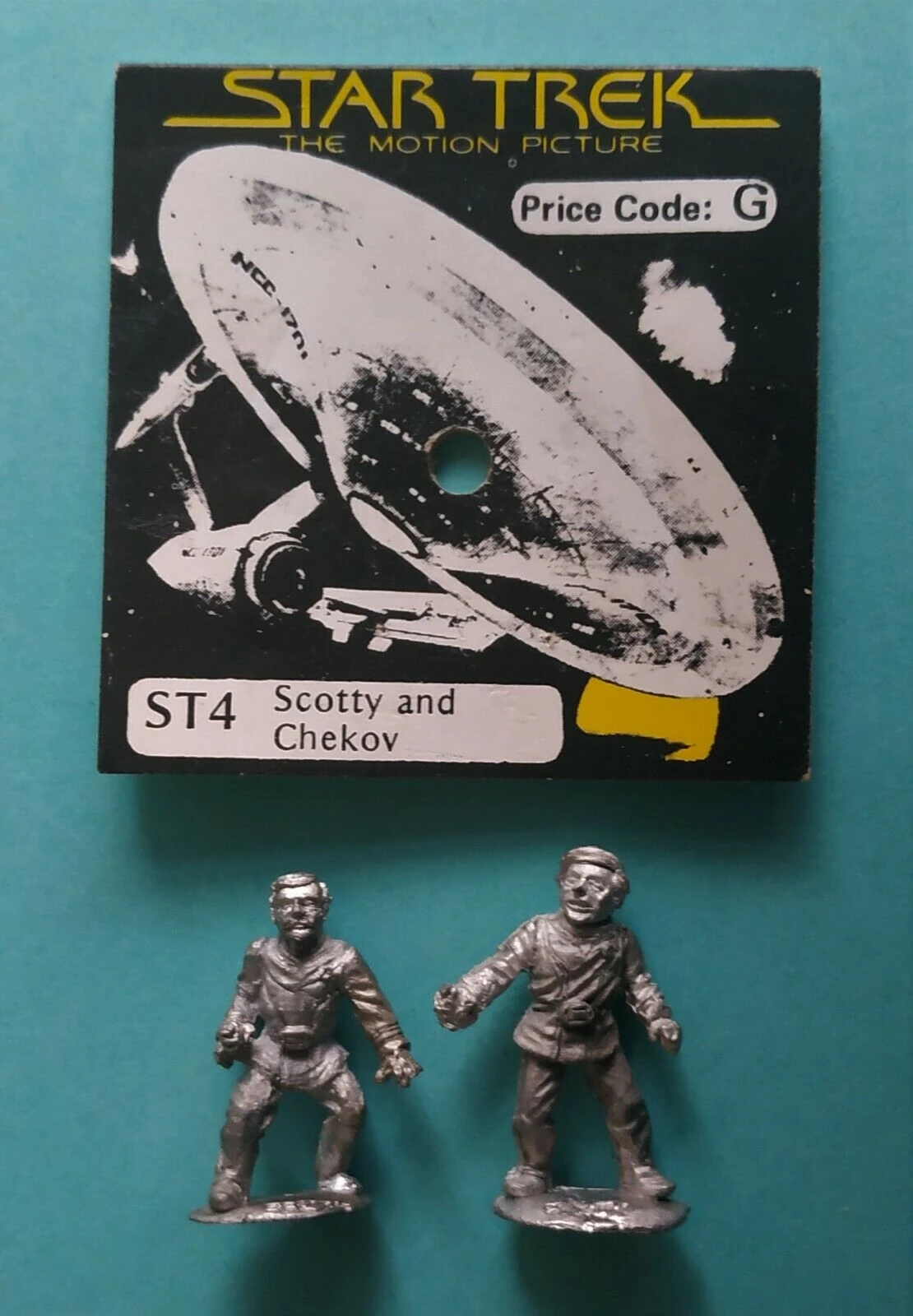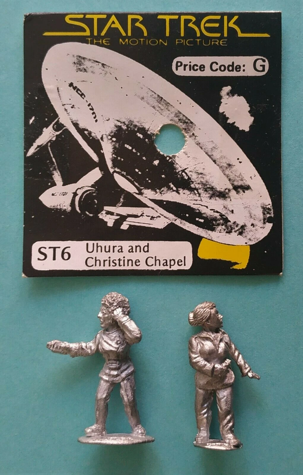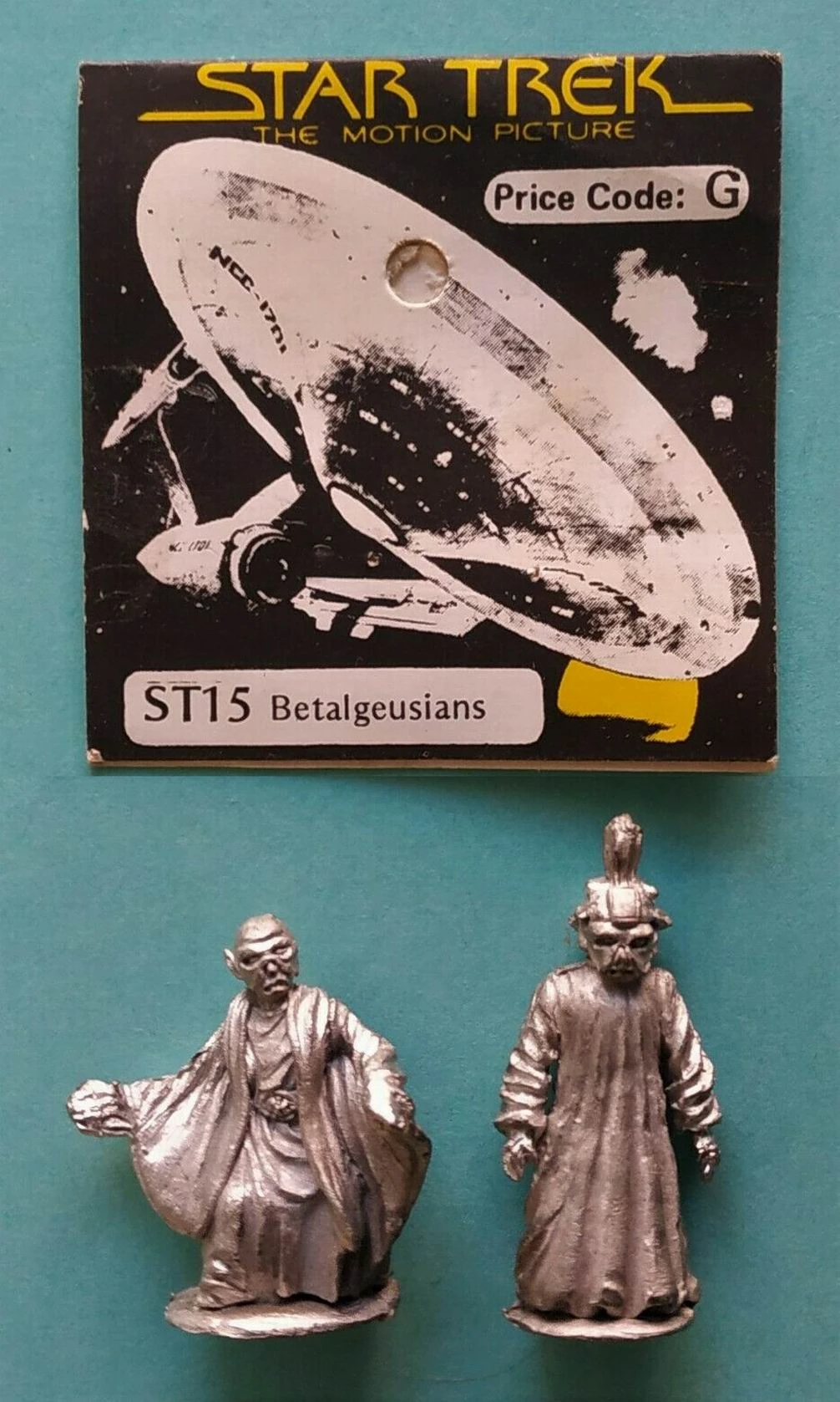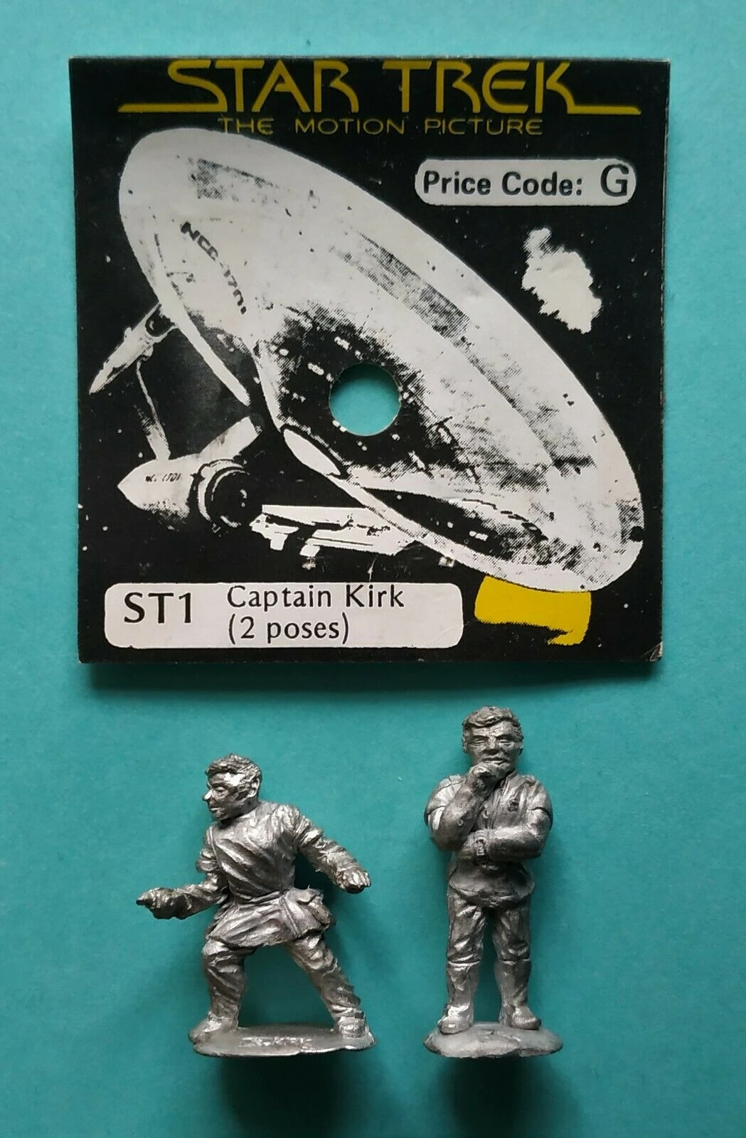 In early 1980, the company issued a line of licensed (as indicated in its Red Catalog of that year) Star Trek 25mm gaming figurine miniatures, capitalizing on Star Trek: The Motion Picture, and associating them with the multitude of background aliens seen in the feature. Sold in 24 pairs, the 25mm white-metal gaming figurines were Citadel originals, not derived from FASA, unlike its later starship miniatures line. The figurines came packaged in a plastic bag stapled shut at the top with an doublefolded identifier header card. There were also four 54mm figures: Kirk in command chair, Spock, Ilia Probe and the Klingon Captain.