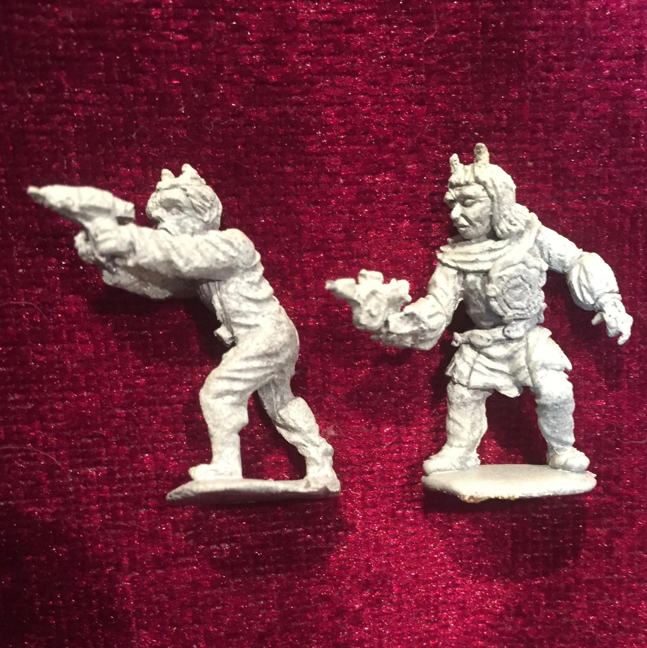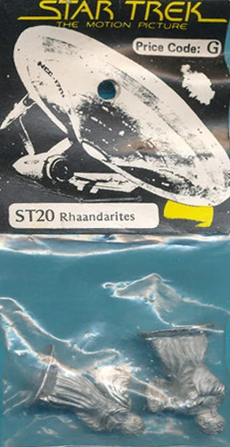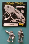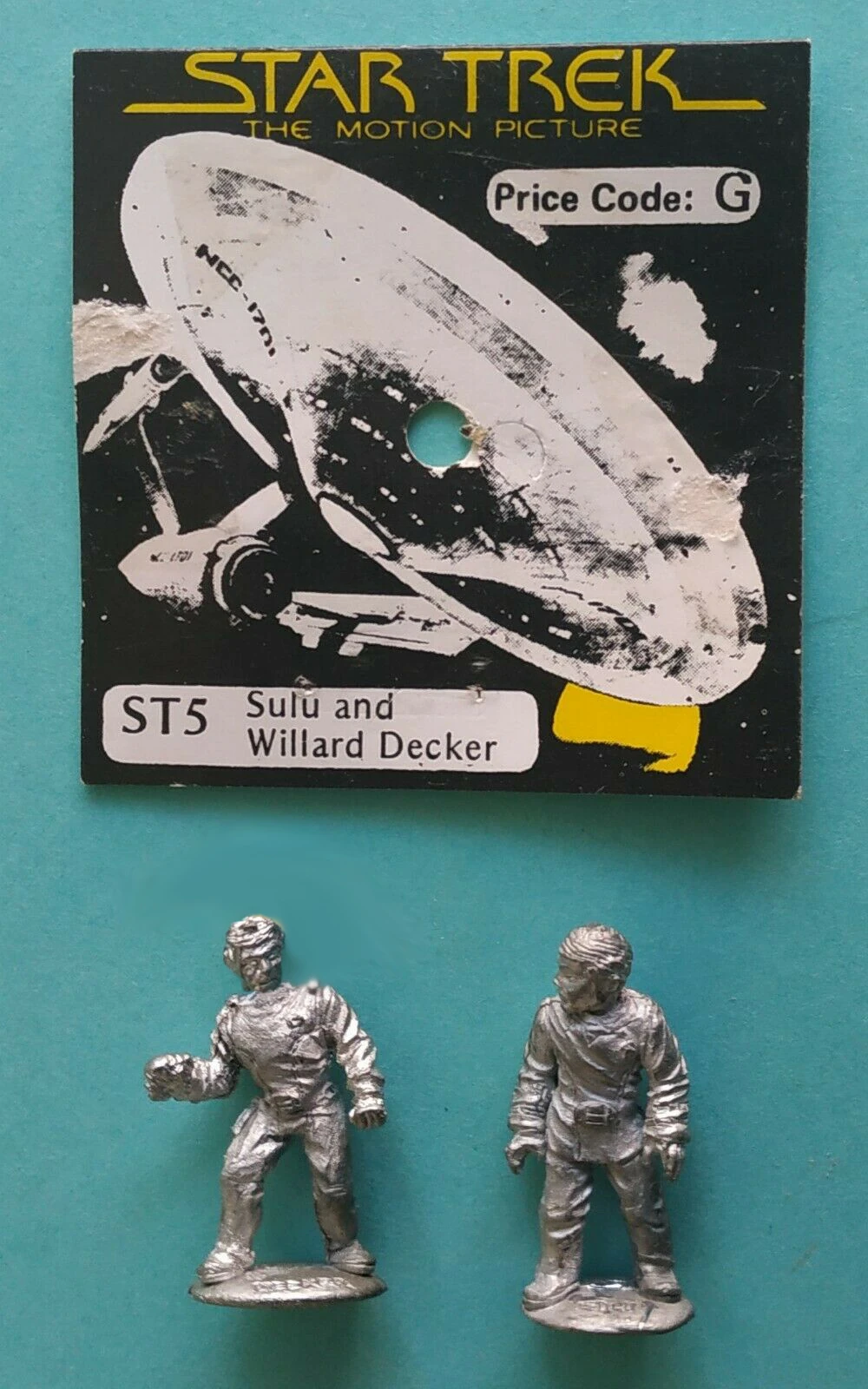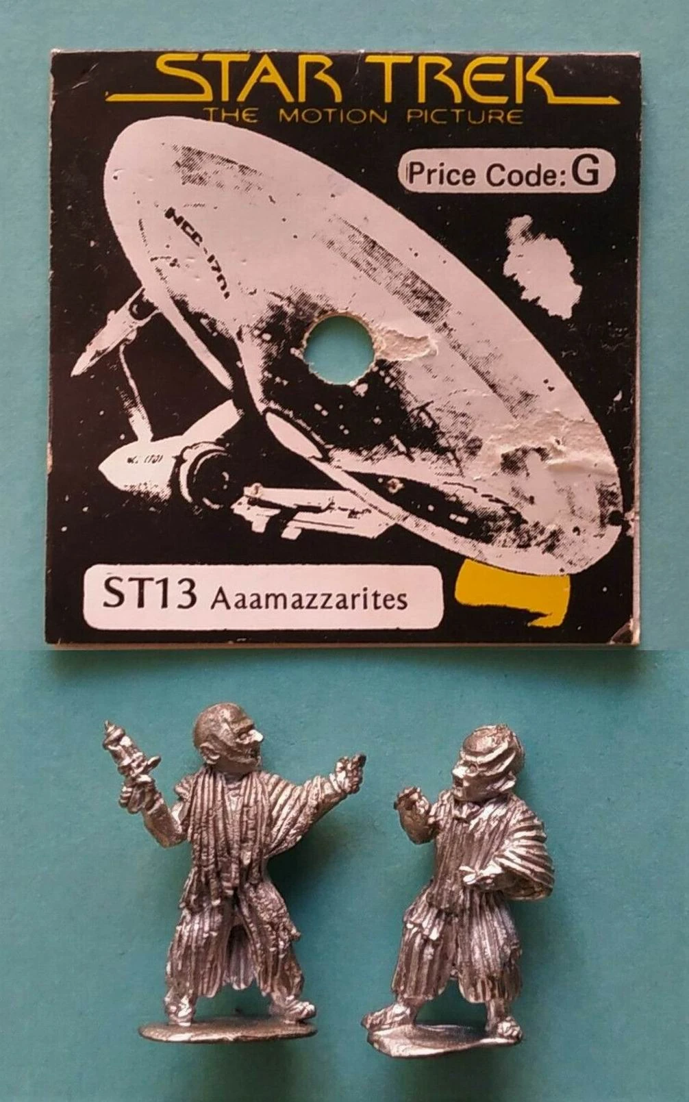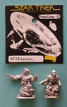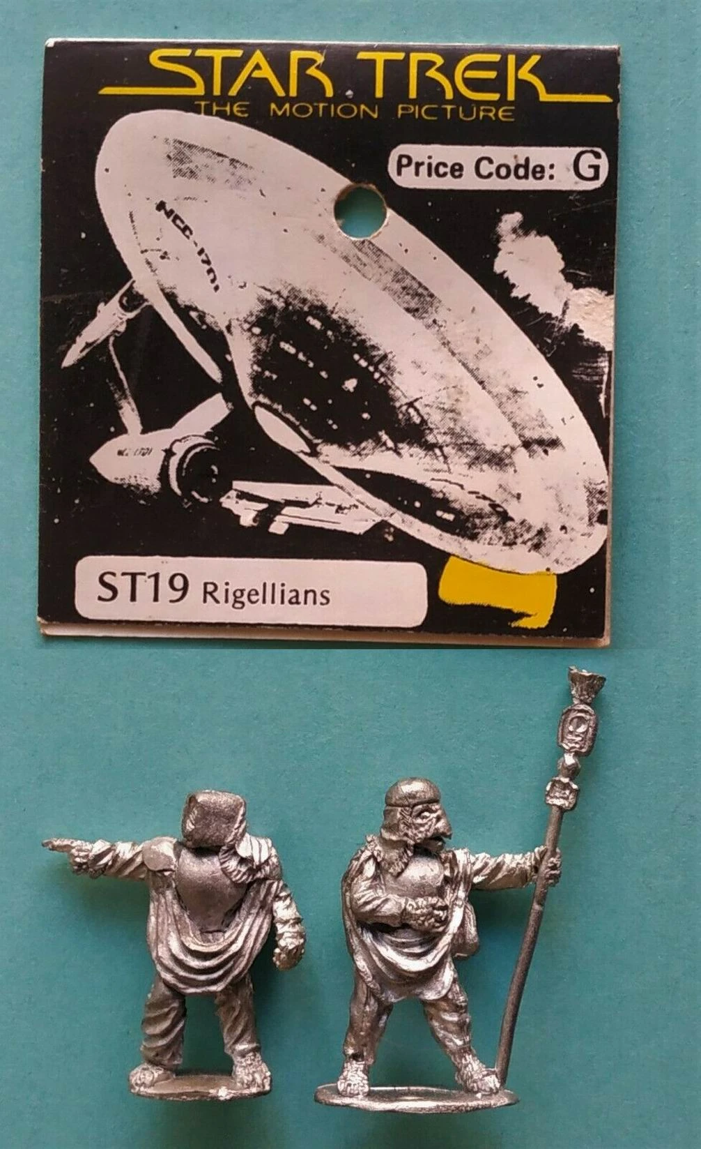 In early 1980, the company issued a line of licensed (as indicated in its Red Catalog of that year) Star Trek 25mm gaming figurine miniatures, capitalizing on Star Trek: The Motion Picture, and associating them with the multitude of background aliens seen in the feature. Sold in 24 pairs, the 25mm white-metal gaming figurines were Citadel originals, not derived from FASA, unlike its later starship miniatures line. The figurines came packaged in a plastic bag stapled shut at the top with an doublefolded identifier header card. There were also four 54mm figures: Kirk in command chair, Spock, Ilia Probe and the Klingon Captain.