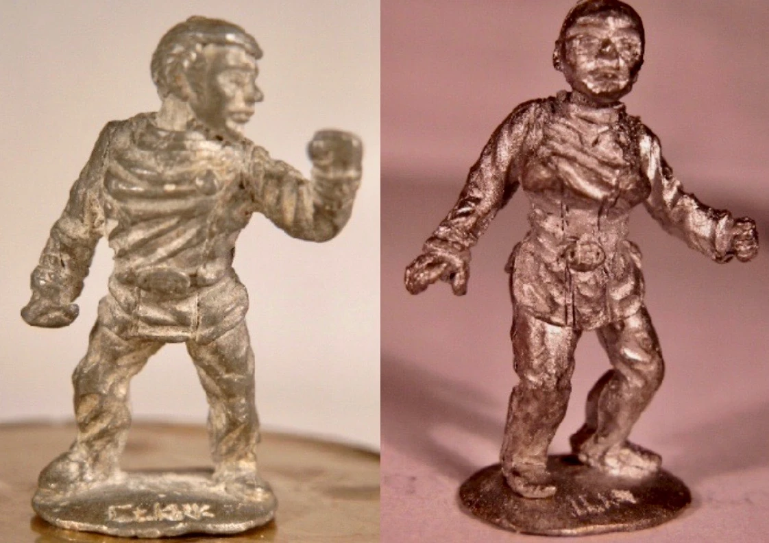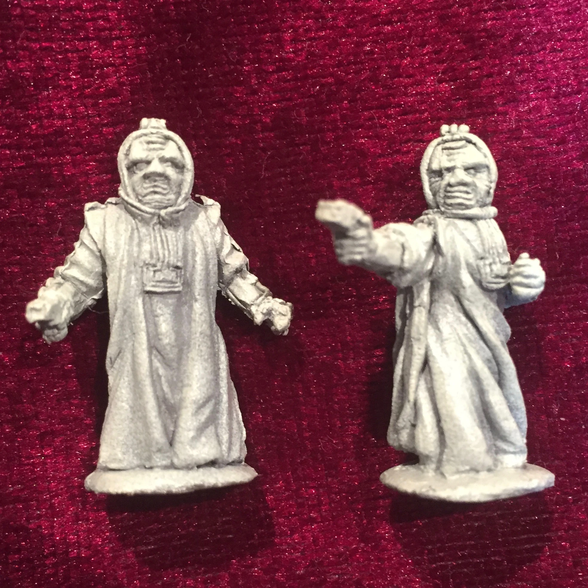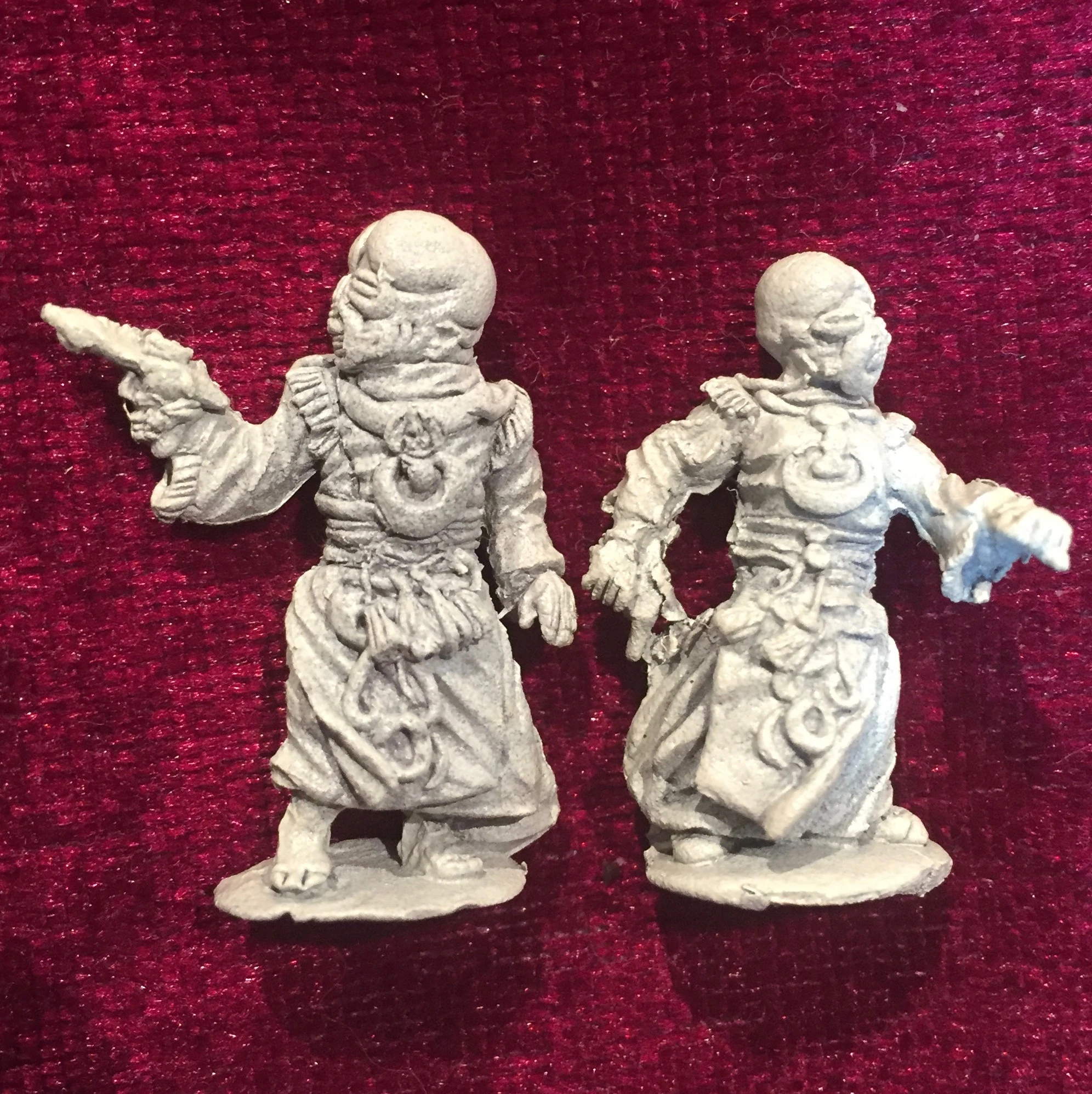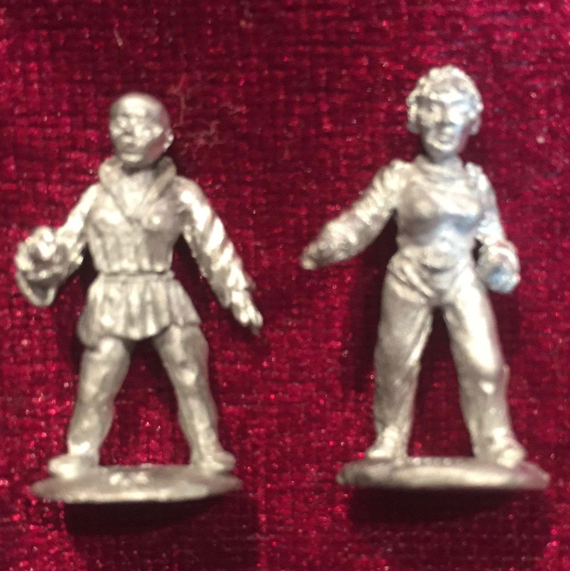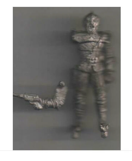 In early 1980, the company issued a line of licensed (as indicated in its Red Catalog of that year) Star Trek 25mm gaming figurine miniatures, capitalizing on Star Trek: The Motion Picture, and associating them with the multitude of background aliens seen in the feature. Sold in 24 pairs, the 25mm white-metal gaming figurines were Citadel originals, not derived from FASA, unlike its later starship miniatures line. The figurines came packaged in a plastic bag stapled shut at the top with an doublefolded identifier header card. There were also four 54mm figures: Kirk in command chair, Spock, Ilia Probe and the Klingon Captain.