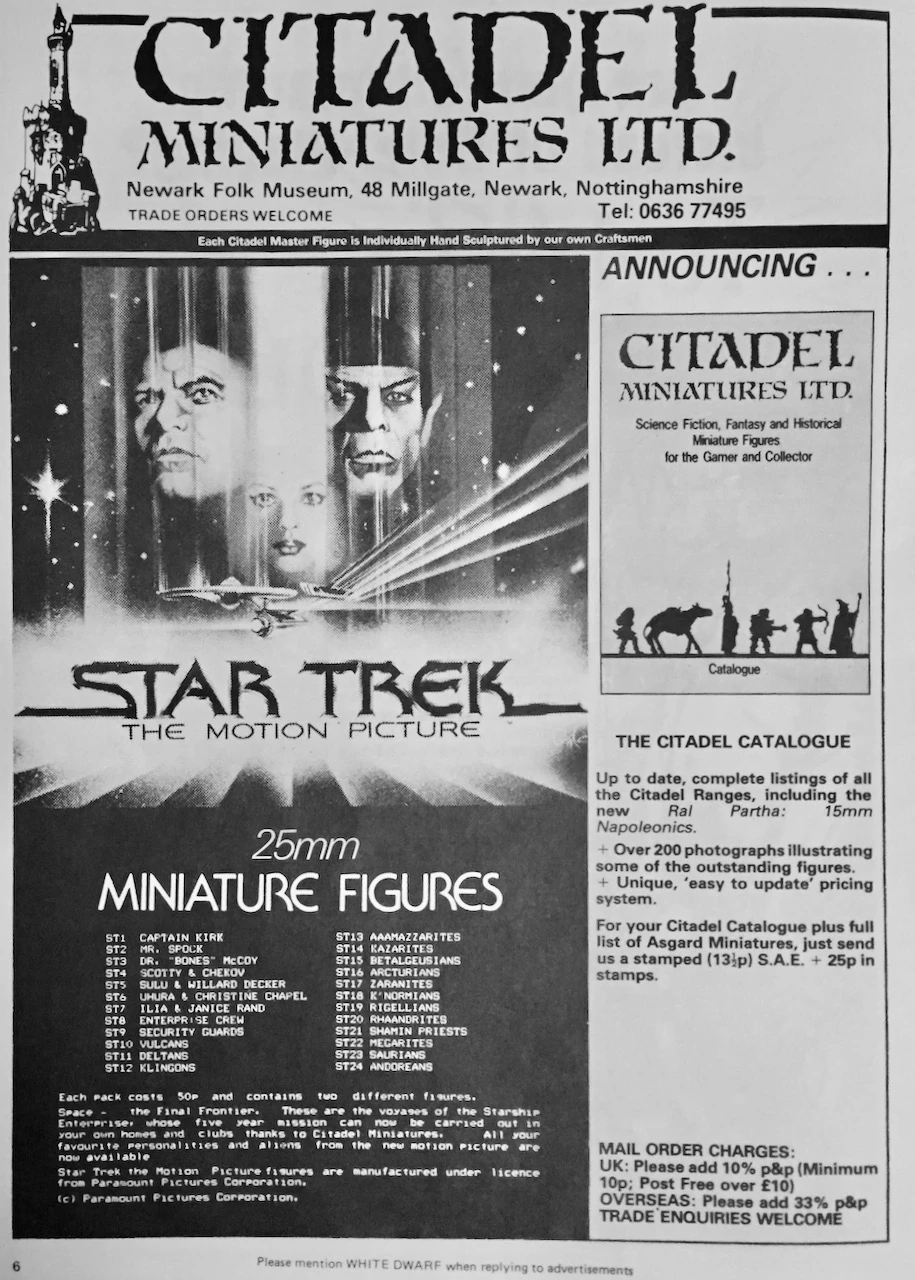 An issue of Games Workshop's White Dwarf, the UK Science Fiction & Fantasy Games and Miniatures Magazine (Issue No. 18, April/May 1980), featured a Motion Picture refit-USS Enterprise cover and an article with a "Miniatures Scenario" (pp. 8-13, written by Tony Yates and Steve Jackson) to promote their Citadel licensed products.