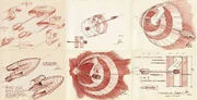 As art director on the original series, Matt Jefferies was given the assignment to design the Enterprise itself, initially with input from Pato Guzman. His only guideline was Gene Roddenberry's firm list of what he did not want to see: any rockets, jets, or fire-streams. The starship was not to look like a classic, and thus dated, science-fiction rocket ship, but neither could it resemble anything that would too quickly date the design. Somewhere between the cartoons of the past and the reality of the present, Matt Jefferies was tasked with presenting a futuristic design of his own, "We also drew on a lot of research material on Flash Gordon and Buck Rogers. Again we said, 'This we will not do.' There have been a lot lot of things that took place in those comic strips that have proven out today, but pictorially we felt they were hokey. They used a lot of air-foil fins and rocket tube-like shapes that had no feeling of practicality or necessity. Roddenberry insisted everything be believable. We had to base it all on fairly solid scientific concepts, project it into the future, and try to visualize what the fourth, fifth or tenth generation of present-day equipment would be like. So working within those limits, Pato and I sat down and began to sketch out ideas. When we had about two walls covered with these sketches, we called Roddenberry in and he looked them over. Damn it but he can be irritating. He liked only a piece of this one or a small part of that one, but none of our ideas had what he really was looking for. So we did twenty-some more designs, using the few elements he had said he liked." (The Making of Star Trek, pp. 79-80)