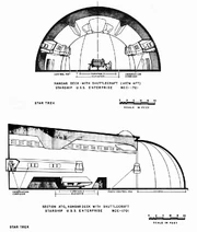 While Jefferies was ironing out the details of his Enterprise design, it became clear that there was to be a "flight deck" or "hangar deck" (Jefferies used both denominations on his design sketches) aft of the engineering hull of the design at very much the place where he had it originally intended. That being said, there was no way, considering the budget restraints, that a full-scale flight deck set was ever to be constructed. Yet when the episode "The Galileo Seven" came along a resolution had to be found, in the process establishing a feature later carried over to the majority of other Starfleet starship classes.