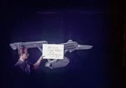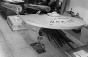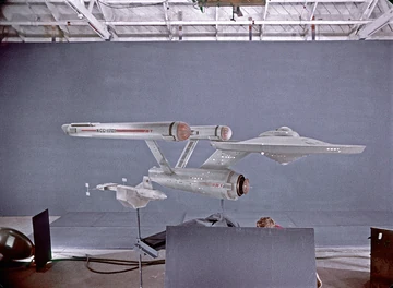 Upon the delivery of the eleven-foot model to the Howard Anderson Company by Datin, the model was retained there for the filming of footage for use in the first pilot, though only the one outstanding scene would actually be filmed there, the extreme "zoom-in on the bridge" sequence, featured at the beginning of the pilot. Before the model was stored away to await the verdict of the studio, some additional test footage, not intended for filming use (as the model was not filmed in front of a blue screen), was shot on 23 January 1965 to establish camera angles. The model was constructed in such a way that it could be suspended from the ceiling and it was filmed as such. An x-ray picture taken later at the Smithsonian revealed that some of the the hooks onto which suspension wires could be attached, were still embedded within the model. It was the only time the model was filmed this way, as it was afterwards only filmed while mounted on a stand, the stand having to serve as guidance of the power cables for the by then added internal lighting rig.