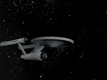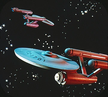 Recognizing her use for forced-perspective shots, Anderson shot stock footage for use in the title sequence and future episodes. Besides "The Cage", the model appeared most notably in "Where No Man Has Gone Before", "Tomorrow is Yesterday", "By Any Other Name", and finally in "Requiem for Methuselah", ironically here as a desktop table model. In between, the model was called upon to go on side-assignment for the View-Master version of "The Omega Glory" (see below). In its last live-action onscreen appearance, it could be discerned that the model had been damaged sometime earlier. Stills show that the hangar deck doors were missing, as well as some of the "intercoolers" on the rear top of the nacelles. In the episodes after the two pilots, the three-footer can be recognized by the fact that she, unlike her big sister, is not lit internally.