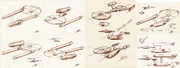 "I was concerned about the design of ship that Gene told me would have 'warp' drive. I thought, 'What the hell is warp drive?' But I gathered that this ship had to have powerful engines – extremely powerful. To me, that meant that they had to be designed away from the body. Boy, I tried a lot of ideas. I wanted to stay away from the flying saucer shape. The ball or sphere, as you'll see in some of the sketches, was my idea but I ended up with the saucer, after all. Gene would come in to look over what I was doing and say, 'I don't like this,' or, 'This looks good.' If Gene liked it, he'd ask the Boss (Herb Solow) and if the Boss liked it, then I'd work on that idea for a while [...] So I worked on it for a while, and a couple of weeks later, Herb and Gene came in. They liked a bit of this and a bit of that, and I worked on those bits. And then I came up with something I really like, so I preloaded it – used lots of color and put it in a prominent place that made it kind of stand out. And that worked! It looked better than the other sketches and Gene said, 'That one looks good!' They – and Bobby Justman, too, when he came aboard later [note: and also including Roddenberry's Science Adviser, Harvey P. Lynn] – were a dream to work with." (Star Trek: The Original Series Sketchbook, p. 62; The Making of Star Trek, p. 80) )