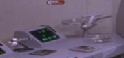 Apart from the movies, commercial models of the original configuration Constitution-class made no appearances as display models in any of the spin-off television series set in the 24th century, save for two occasions in Star Trek: The Next Generation. The first time such a model made an appearance was in the first season episode "Booby Trap", were a model could be seen on display in Drafting Room 5 of the Mars Station. Being a smaller scaled model, measuring approximately eight inches, it did originate from the smaller, 1:1600 scaled, 1984 or 1989 issue of the three-piece AMT model kit, No. 6677.