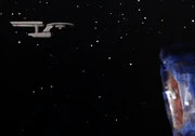As Howard A. Anderson, Jr. of the Howard Anderson Company remembered, "In "The Corbomite Maneuver" we used a tiny four-inch model made by Matt Jefferies of the Enterprise to use in front of the huge alien ship to make it look even bigger. We also had an occasion to shoot Datin's three-foot Enterprise model from time to time and we used all three models in the main title sequence. We shot a lot of library footage using that little four-inch model but I can't remember any specific episode titles where it was used. We mostly used the 12-foot model." (Cinefantastique, Vol. 27, issue 11/12, p. 67) On a later occasion Anderson had added, "The only other model that we had in those first two years of pilots was a little one that Matt Jefferies made that was about four or five inches long that was just a very simple, straight-forward model. We used that first before we ever finished the big model to do some shots – run-bys, to get speed and those test shots, were two years later used in the main title. When we shot the little model, we were able to do that in a clean run on a lathe bed that we had built." [61](X)