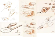 The design process itself, however, proved to be arduous and time-consuming. Starting from Roddenberry's ambiguous guidelines, Jefferies started out by experimenting with shapes, as he recalls; "There was a lot of floundering going on because I didn't know where the hell we were going and I had to start coming up with an envelope to work inside of. I did hundreds of sketches. Gene liked a piece of this and a piece of something else, so I tried to see what I could do with the pieces." Dozens more sketches followed, experimenting with the configuration of the selected components. "My thinking was, because of the ship's speed, there had to be terrifically powerful engines. They might be dangerous to be around, so maybe we'd better put them out of the way somewhere, which would also make them what, in aviation circles, we call the QCU – quick change units – where you could easily take one off and put another on. Then for the hull, I didn't really want a saucer because of the term 'flying saucer', and the best pressure vessel of course is a ball, so I started playing with that. But the bulk got in the way and the ball just didn't work. I flattened it out and I guess we wound up with a saucer!" (Star Trek: The Magazine Volume 1, Issue 10, p. 25)