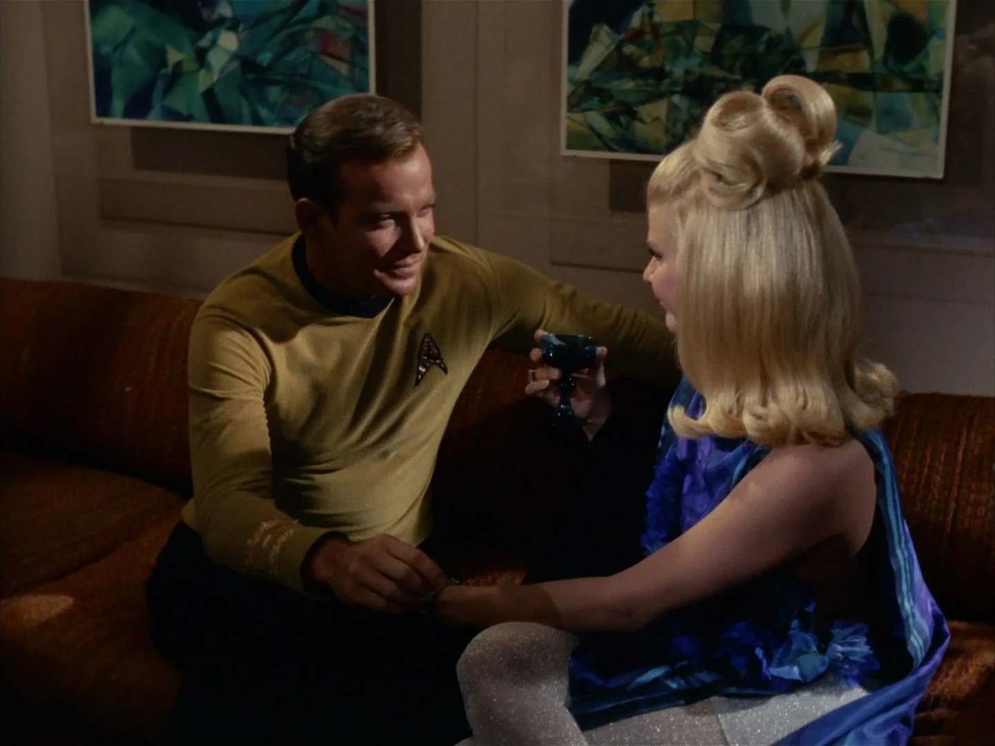 Later, actress Lenore Karidian, who had played Lady Macbeth in the play, and Captain James T. Kirk, who had observed the performance, sat on a couch at a cocktail party on Planet Q. (TOS: "The Conscience of the King")