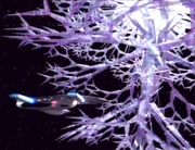 In its very first appearance, the Crystalline Entity was one of the very first CGI sequences used in the Star Trek franchise. It was built and rendered by Chris Alsop at The Post Group (Star Trek: Communicator issue 148, p. 49). Conceived and constructed well before the breakthrough of the technique, CGI was in 1987 a very costly, and, even more importantly as far as a week-by-week television production was concerned, a very time consuming proposition, as Visual Effects Coordinator Ronald B. Moore has dryly observed, "This was very early in the development of CG to be doing something like this for television but we were game. It took a long time to build the model and it was extremely costly. When the show was finished and we were watching the final results I remember Rob [Legato] commenting that we could have painted a tumbleweed white and shot that. It would have cost less and we would have been done much sooner. I think he was right: it might have worked just as well." (Flying Starships, p. 41) The very first full-textured CGI effect in Star Trek was the Genesis file in Star Trek II: The Wrath of Khan.