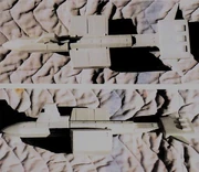 The studio model of the DY-100-class, measuring 43" × 18" (aft section) × 12.25" (height), was mostly constructed out of wood, as was usual in that era, embellished with miscellaneous model kit parts and metal components. The leading edge of the "sail" (a naval term for the tower structure found on most submarines) features a corrugated metal foil and the engine pod includes metal "antennas" and masts. The model was not internally lighted and was finished in a brown/red-gray hue, though that finish was washed out into an overall gray on screen, due to bright lighting conditions in the studio and the use of the blue screen filming technique causing light to bounce off the screen onto the model, an effect known as "blue spill". While not built by Jefferies, he did add the weathering on the model. According to its item description in the below-mentioned Heritage auction, the model was actually built at Linwood G. Dunn's Film Effects of Hollywood, and it was there where the only footage of the model was shot upon its completion during the winter of 1966/67. Despite "Space Seed" having been in essence an in theory cost-saving bottle show, it was actually the build and filming of the model that became the primary reasons for the episode's budget overrun by US$12,262. (These Are the Voyages: TOS Season One, 1st ed, p. 453) Its one later appearance as the Woden in the original airing of "The Ultimate Computer" was stock footage of that shoot. (Cinefantastique, Vol. 27, No. 11/12, pp. 70-71) In the 2006 remastered version of the episode, the footage of the Woden was replaced by a newly constructed CGI model.