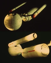 Nor has Okuda corrected this for subsequent editions of the Chronology/Encyclopedia, when he took new, additional color photographs of the model, but by careful angling and lighting, the registry for Essex has remained obscured. Interestingly, at the time the nacelles were equipped with spikes akin to those seen on the original Enterprise studio model in "The Cage". Apart from photographing the model, Okuda had Drexler also retouch the photos for representation in the Chronology/Encyclopedia by adding background and lighted windows (neither this model nor the later copies were equipped with an internal lighting rig), whereas for the later Chronology/Encyclopedia color editions, beauty stills of the model against planet backdrops were composited by Visual Effects Supervisor Gary Hutzel. (Star Trek Chronology, 2nd ed., p. ix)