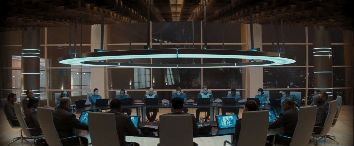 The Daystrom Conference Room was a Starfleet Command meeting location at Starfleet Headquarters in San Francisco in the 2250s of the alternate reality. The room was in a high-rise building which also featured at least one landing pad. Starfleet protocol dictated that urgent meetings of Starfleet admirals and other top officers, arranged in response to an emergency situation, be held in this room.