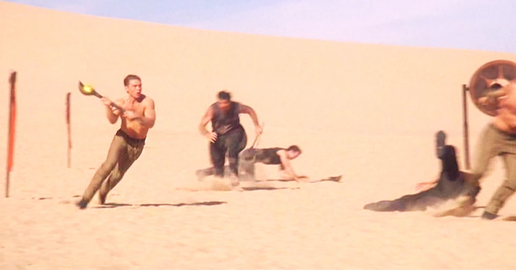 Sounds are heard, indicating the start of a Geskana match. A glowing ball is passed between players with sticks, who attempt to throw the ball into a goal. Tucker and Archer then agree to play.