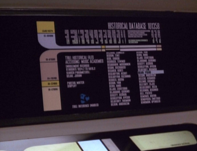 In 2371, Benjamin Sisko and Julian Bashir looked up the enrollment records for all Trill music academies in Joran Belar's lifetime an attempt to find more information on him. Instead, they found Yolad Belar, surmising (correctly) that the two were related. (DS9: "Equilibrium")