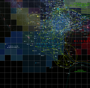 Control's priority message to Alpha Squad leader included an overview over central Federation space and adjoined territories. It showed the location of the Romulan Star Empire, the Klingon Empire, the Gorn Hegemony, and the Tholian Assembly. It also highlighted the Federation border as defined by the Treaty of Ka'Tann, which prohibited Starfleet officers from crossing over and taking direct action in neighboring systems. The map revealed the location of the renegade Philippa Georgiou in border territory outside of Federation space, necessitating more covert actions to establish contact with her. (Star Trek: Section 31)