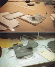 Adopting the hands-on approach from then on, Probert kept in very close contact with the model shop of ILM during the build of the two models. A second clay study model was commissioned (constructed around a carton skeletal structure for internal integrity), this time as a two-part model to reflect the saucer separation capability. This time the model followed more closely the lines of the ship Probert had in mind. By the time the model was delivered to the producers, construction on the larger studio model had already started. (Star Trek: The Next Generation - The Continuing Mission, pp. 18-20) Again built by Jein, this version was presented in person by an ILM representative to Roddenberry at his Paramount office for his approval, after which the model was used by John Knoll to test out his below-mentioned "slit-scan" technique. Not seen for decades afterwards, the study model resurfaced in the collection of ScienceFictionArchives.com, an European organization that is dedicated to preserve science fiction production assets for public display purposes, such as in museums. [3] The whereabouts of the first concept model though, remain unknown.