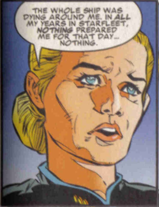 - This story in some ways parallels the events of TNG: "Yesterday's Enterprise" (meeting persons time-traveling from a past battlefield, a dedicated crew member desiring to help the fight), but with a very different driving theme – in the Star Trek: The Next Generation installment, Picard was obligated to send the refugees back in time to fulfill their roles in the battle, in this comic the crew decides that 16 people wouldn't have made a difference in the hopeless battle, and Janeway orders them to try and counteract the effect by dragging survivors back into the rift.