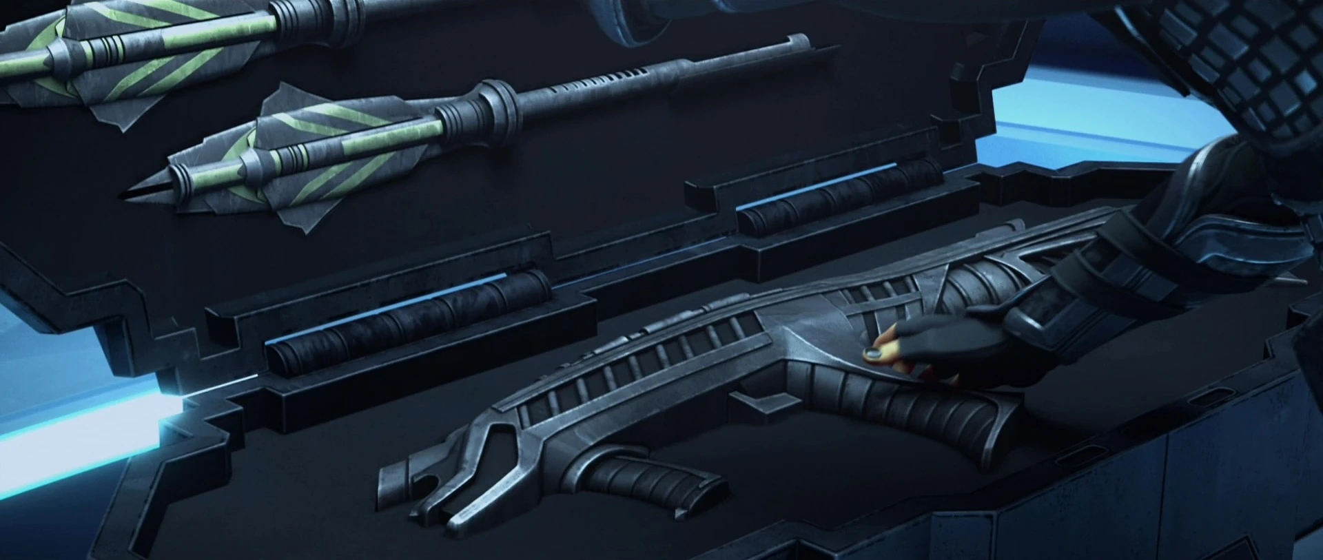 In 2384, a Romulan Tal Shiar commando attempted to use a grappling gun to board a carriage being used by Dal R'El, Gwyn, Rok-Tahk, and Murf to ascend the space elevator on Noble Isle. However, the metallic harpoon-shaped grapple attracted a lightning strike that incapacitated them. (PRO: "Masquerade")