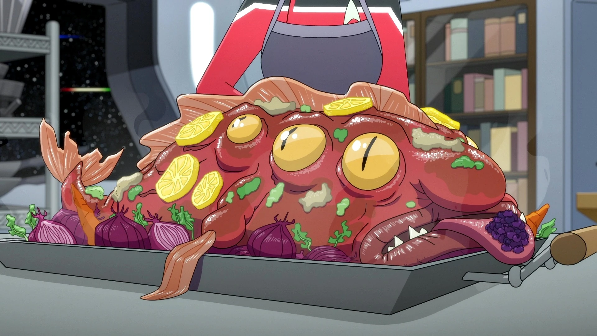 After being castigated by food critics Legnog and Gonald in 2382 for serving them replicated food, Doctor Gabers Migleemo attempted to redeem himself by preparing hogfish galantine, assisted by Captain Carol Freeman, Lieutenant jg D'Vana Tendi, and Lieutenant jg Sam Rutherford. However, Legnog and Gonald denounced the dish as bland. It later emerged that the pair previously had lost their sense of taste. (LD: "A Farewell To Farms")